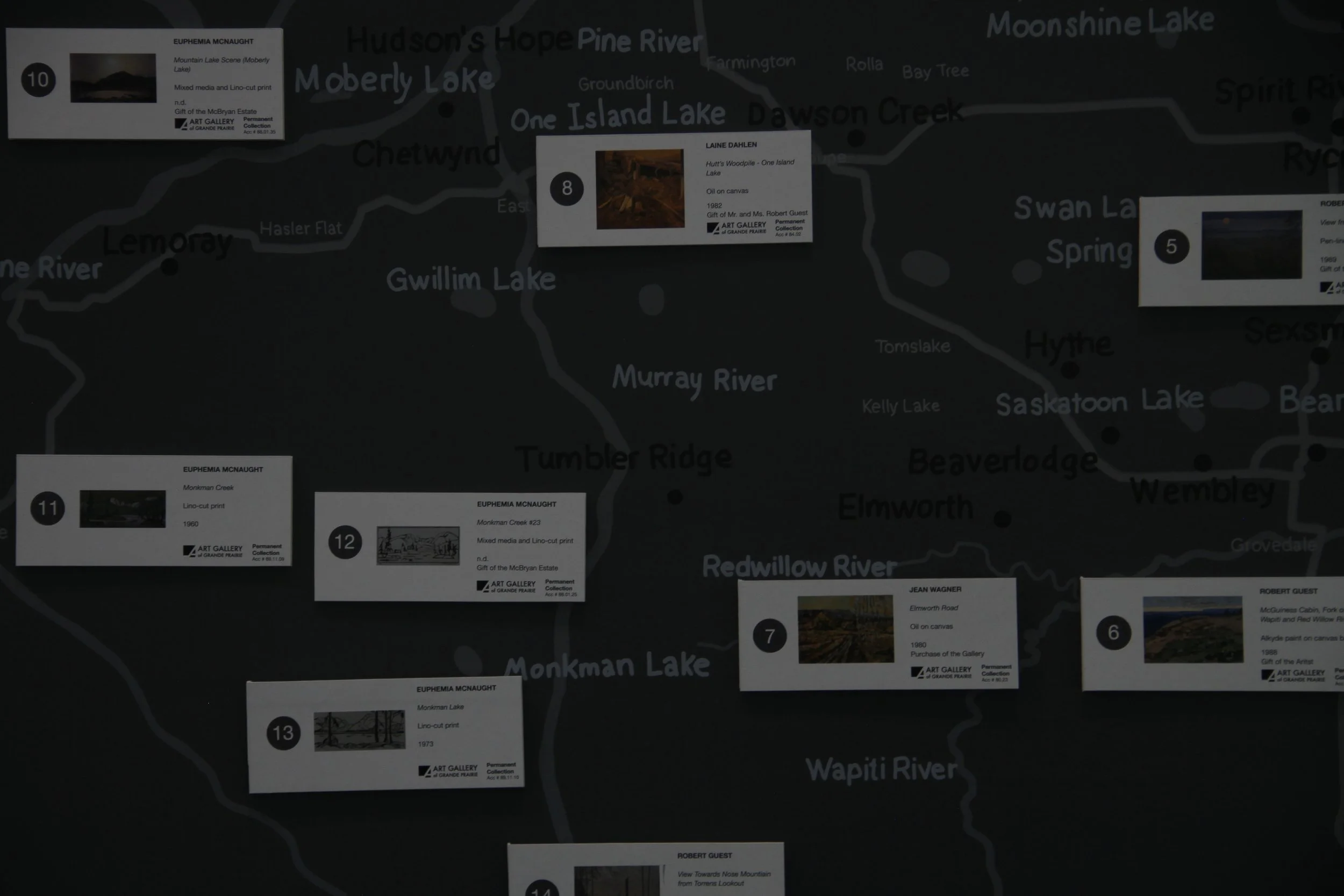 Rest Stops: Mapping out the Permanent Collection will take visitors on a journey through artworks from our Permanent Collection that immortalize some of the Peace Country’s precious spaces. The large-scale map connects the artwork to the locations that inspired them. Through this association we hope to unravel an even greater sense of place and connection to this land and each other.